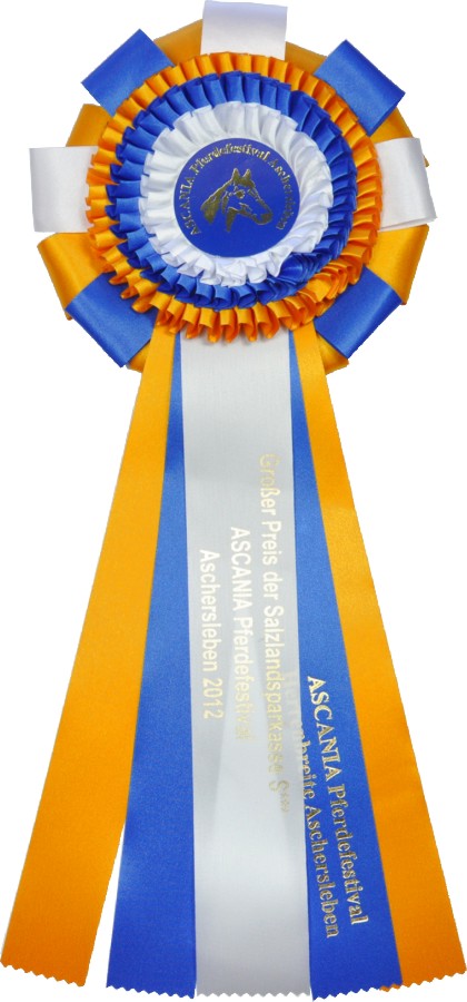 En strålende skønhed er vores Tredobbelt roset "Wiesbaden" i Premium kvalitet, der monteres på 16 store Løkker. Den ydre ring af rosetten er i en glitrende guld, efterfulgt af placering farven og afsluttet med den indre hvide ring. De seksten loops er vekslende i de samme farver (guld - placering farve - guld - hvid). Denne særlige roset afsluttes med fem 35 cm lange bånd, i de passende farver: guld til venstre og højre, to bånd i placering farve ovenfor og til slut et hvidt bånd øverst. Det hvide bånd er ideelt til din personlige tryk.