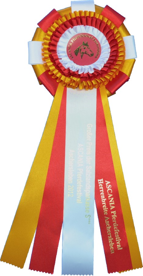 En strålende skønhed er vores Tredobbelt roset "Wiesbaden" i Premium kvalitet, der monteres på 16 store Løkker. Den ydre ring af rosetten er i en glitrende guld, efterfulgt af placering farven og afsluttet med den indre hvide ring. De seksten loops er vekslende i de samme farver (guld - placering farve - guld - hvid). Denne særlige roset afsluttes med fem 35 cm lange bånd, i de passende farver: guld til venstre og højre, to bånd i placering farve ovenfor og til slut et hvidt bånd øverst. Det hvide bånd er ideelt til din personlige tryk.